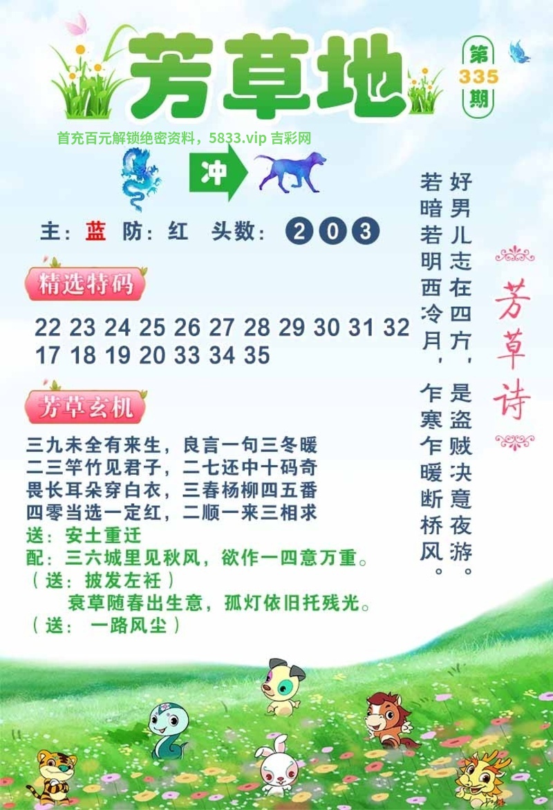 | 338期芳草玄机:一帆风顺蛇虎午,沾亲带故取蓝红。异想天开七月七,数一数二今肖来。狗拿耗子三更天,龙虎争一伴二七。狗撵兔子势凶残,春秋一轮左右开。 芳草诗:大雁南飞择木栖,先鋒已过玉门关。山边树林一行行,迎风遥相望无边。 特肖:鼠猪狗虎羊牛鸡 波色:绿红 头数:130 |